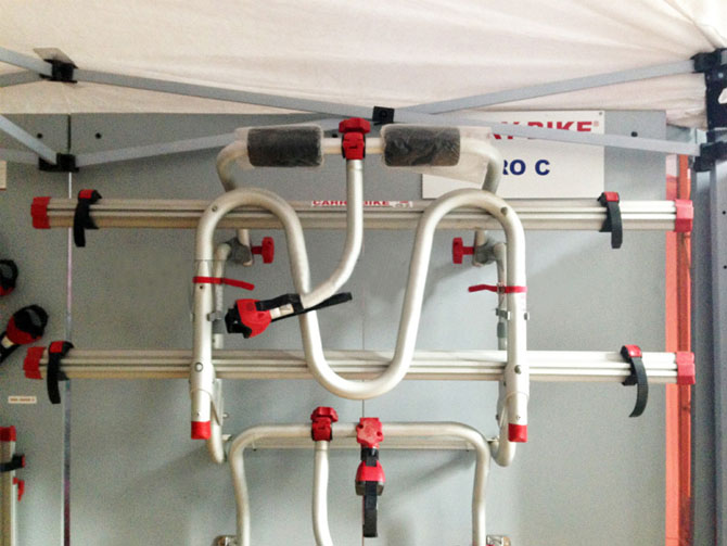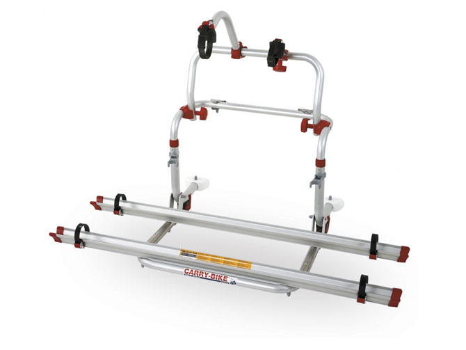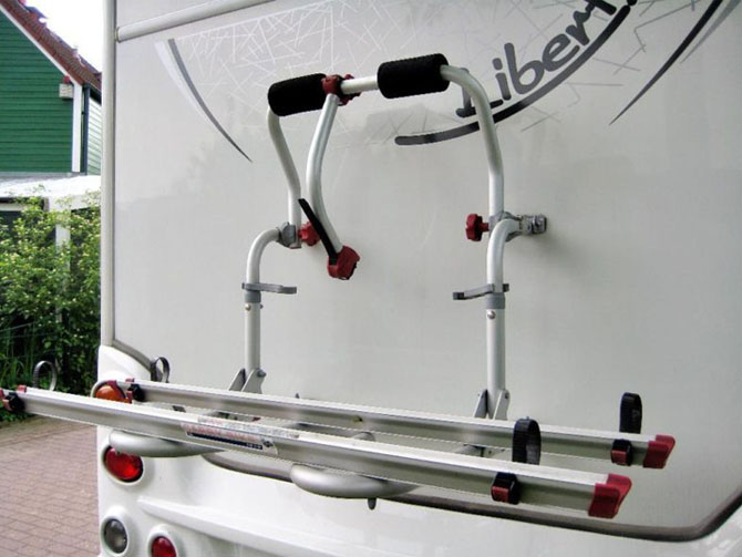 自行車(chē)相對(duì)于房車(chē)而言,是一種延伸和補(bǔ)充,一個(gè)自行車(chē)架可以存放一至兩輛自行車(chē),方便全家人縱情山水,擴(kuò)展旅游范圍。房車(chē)扎營(yíng)以后,如果去超市、買(mǎi)菜、或者去附近的地方辦點(diǎn)事情,這時(shí)就可以借助便利的自行車(chē),不用開(kāi)著房車(chē)到處找停車(chē)位了,另外,有小朋友的車(chē)友也可以用它攜帶兒童自行車(chē)。對(duì)于限制車(chē)輛進(jìn)入的旅游景點(diǎn),自行車(chē)的優(yōu)勢(shì)就更加明顯。 自行車(chē)架與后爬梯一樣,在上牌時(shí)長(zhǎng)度也會(huì)納入車(chē)身總長(zhǎng)度,長(zhǎng)度增加約30CM,車(chē)友們需要注意。要注意的是自行車(chē)架的承重能力,絕對(duì)不要超重,以免造成出行人員及車(chē)輛的損傷。意大利菲亞瑪Fiamma自行車(chē)架采用堅(jiān)固的陽(yáng)極氧化處理鋁合金支架,高度可以伸縮調(diào)整。
