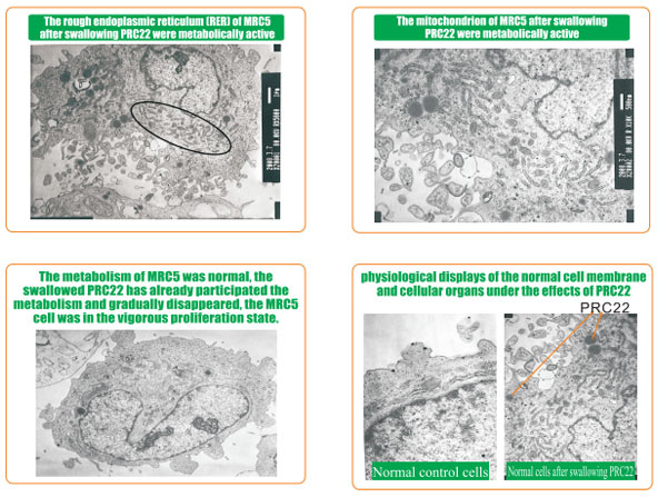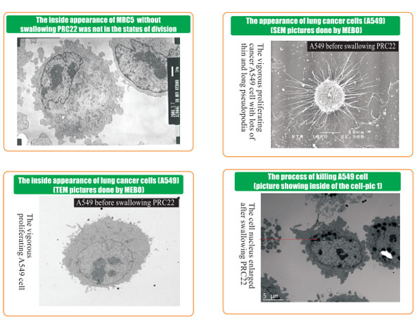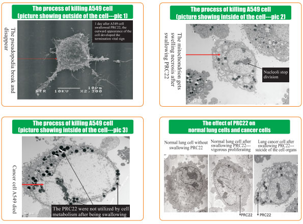 These results indicated that for normal control lung cells, regenerative substance was a kind of regenerative nutrition; while for cancer cells, regenerative substance was fatal. The results also showed that regenerative substances acted first in cytoplasm, then in nucleus. This will probably be a new approach for us to overcome cancer. (See pictures of electron microscope)