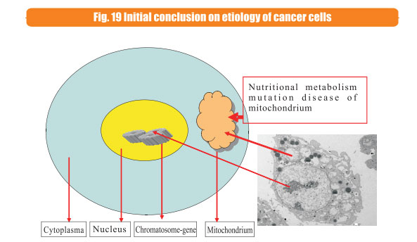 5. We observed, during the apoptosis of cancer cells, mitochondrion swelled and necrotized firstly, nucleus changes succeeded; so we think that cell carcinogenesis occurs in mitochondrion firstly. (See fig.19)