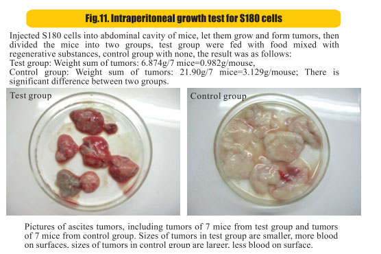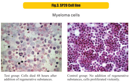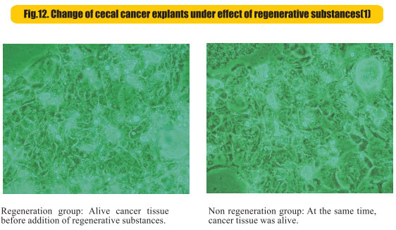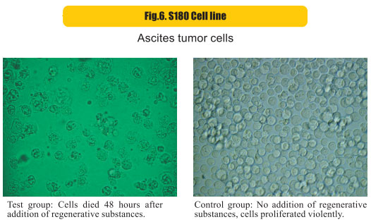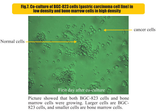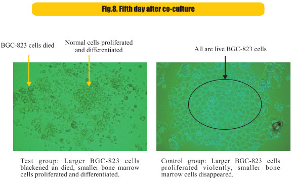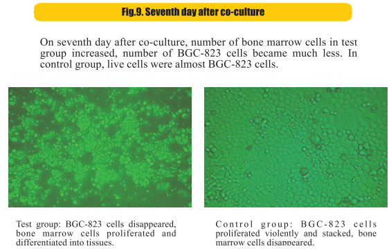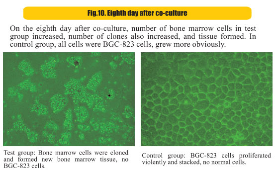 Co-cultured mouse bone marrow progenitor cells and gastric cancer cell line BGC-823, added a certain amount of regenerative substances, cancer cells died and disappeared within 5 days, but mouse bone marrow progenitor cells proliferated and formed tissue colonise of bone marrow. In control group containing no regenerative substances, bone marrow progenitor cells died and disappeared, and at the same time gastric cancer cell lines proliferated vigorously. (See Fig.7-10)