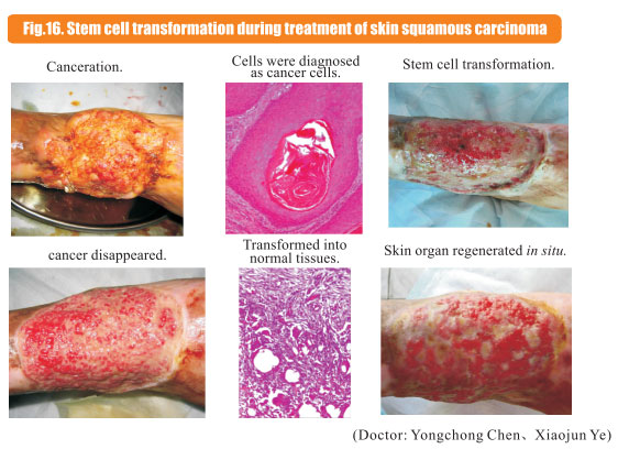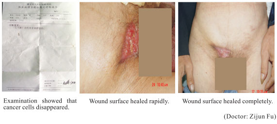 Squamous cell carcinoma patients: Clear the necrotic tissue from the surface of the cancer tissue, expose fresh and live cancer tissue, then smear regenerative substances, and change the regenerative substances twice daily; 21 days later, cancer cells in the skin carcinoma wound disappeared, and then the skin healed. (See fig.16)