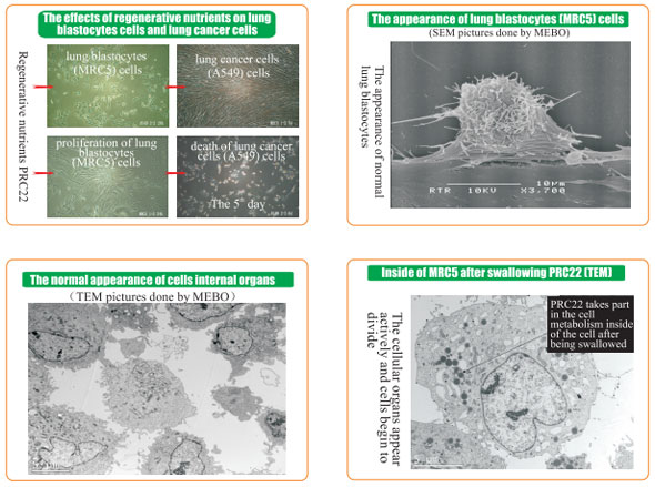 The result was as follows: after the normal cells swallowed the regenerative substances, metabolism of the cell organelles was stimulated, nuclei divided actively, regenerative substances were exhausted by metabolism; however, no obvious proliferation occurred to normal control lung cells without presentation of regenerative substances. After lung cancer cells swallowed the regenerative substances, metabolism of organelles of cells stopped on the instant; on the first day, pseudopodia of cells broke, mitochondrion swelled and died, chromocenters contracted, metabolism and exhaustion did not happened to the phagocytized regenerative substances, and cells died in apoptosis on the second day with no changes for phagocytized regenerative substances.