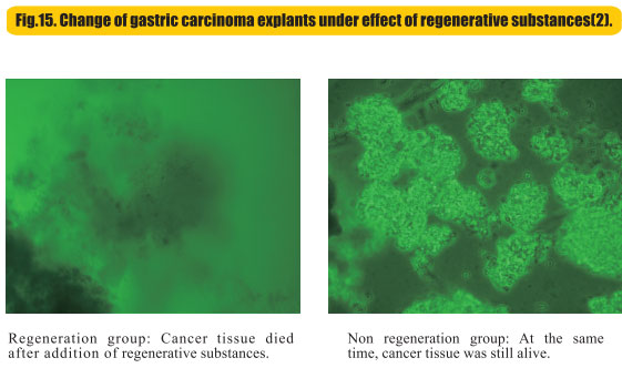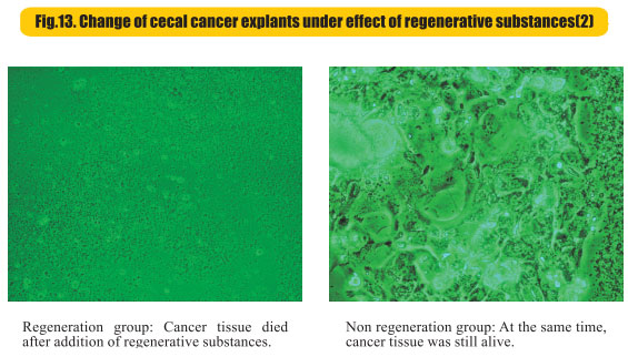 Culture tissue explants from human gastric cancer and human cecum cancer respectively in vitro, and divide the explants into two groups, one group added with regenerative substances (test group), the other not (control group). The result was: explants in test group died one week later, and explants in control group survived. (See fig. 12-15)