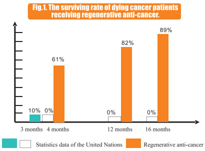 We have deciphered the growth law of cancer cells on cellular levels, and also construed the law of cell organelle change as one of the events that regenerative substances leads cancer cells to apoptosis. In January, 2008, we declared that we had overcome cancers. According to the previous cancer cell research data, we began to carry on the research on nutritional caring for the dying cancer patients, in this program, we use 'total nutrient dietotherapy' to help the patients to relieve pain and prolong life span, the statistic data indicated that the surviving rate was 61% in the starting 4 months, 82% in 12 months, and 89% in 16 months. These basic research has showed the possibility of overcoming cancers in the near future. (See Fig.1)