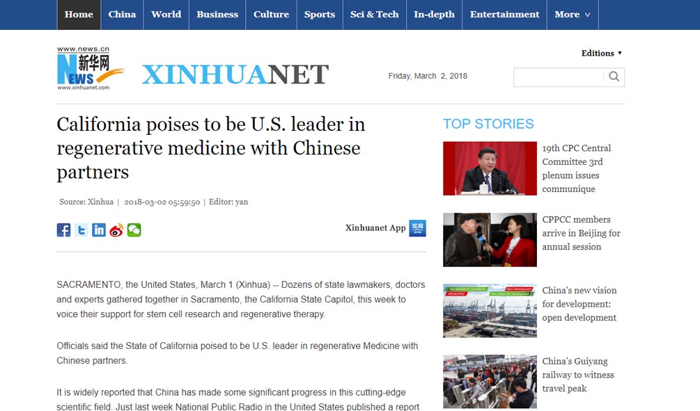 新華網(wǎng):加州與中國(guó)伙伴合作有意成為美國(guó)再生醫(yī)學(xué)領(lǐng)路人