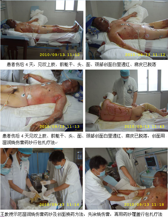 為確保對(duì)該患者的成功救治,王教授又于2010年9月28日再次到惠陽(yáng)區(qū)第一人民醫(yī)院指導(dǎo)對(duì)該患者的救治工作,并深入病房,親自為患者清創(chuàng)換藥,指導(dǎo)主管大夫如何規(guī)范處理患者液化期III度創(chuàng)面的壞死組織和清創(chuàng)方法。