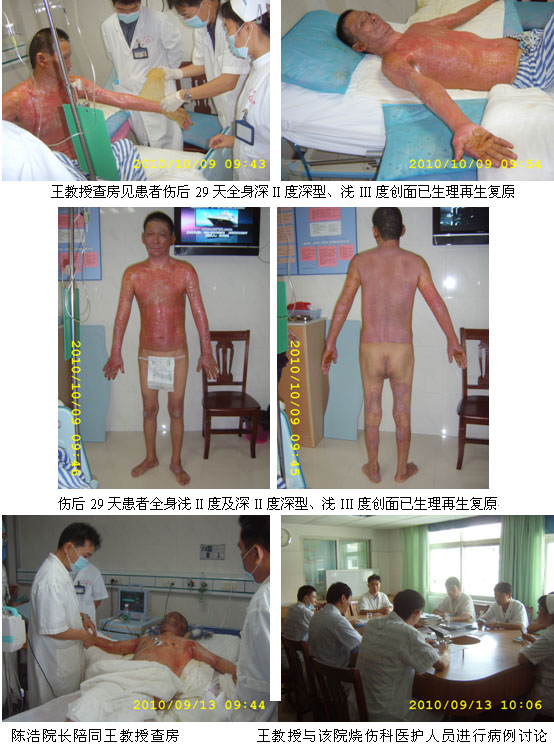2010年10月9日,對(duì)惠陽(yáng)區(qū)第一人民醫(yī)院燒傷整形手足顯微外科和他們收治的這例大面積深度燒傷患者來(lái)說(shuō),都是值得慶祝的日子,經(jīng)過(guò)該科醫(yī)護(hù)人員30多個(gè)夜以繼日的精心治療,該患者深度燒傷創(chuàng)面未進(jìn)行切、削痂植皮,全程應(yīng)用燒傷皮膚原位再生復(fù)原技術(shù)治療創(chuàng)面,實(shí)現(xiàn)了皮膚組織器官的原位再生復(fù)原,避免了殘疾。當(dāng)日上午9時(shí),王洪生教授再次來(lái)到惠陽(yáng)區(qū)第一人民醫(yī)院,在該院陳浩院長(zhǎng)以及燒傷手足顯微外科葉琪毅主任陪同,深入燒傷病房為患者查房,指導(dǎo)醫(yī)生對(duì)患者創(chuàng)面康復(fù)期的治療,并為剛剛收治的1例燒傷總面積達(dá)45%TBSA的深度燒傷患者進(jìn)行了會(huì)診和指導(dǎo)。