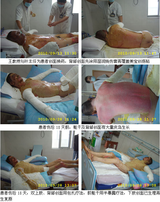 2010年9月11日,惠陽(yáng)區(qū)第一人民醫(yī)院收治了1例煤氣火焰燒傷的患者,燒傷深度為Ⅱ度~Ⅲ度燒傷,全身燒傷總面積達(dá)65%TBSA,大部分創(chuàng)面為深Ⅱ度深型和淺Ⅲ度創(chuàng)面。該院燒傷科主管醫(yī)生認(rèn)為該患者必需進(jìn)行切削痂植皮手術(shù),手術(shù)需要8名醫(yī)生參與,由于該院燒傷整形科剛剛與手足顯微外科合并,無(wú)法進(jìn)行切痂植皮手術(shù),主治醫(yī)師主張轉(zhuǎn)到上級(jí)醫(yī)院治療。該科主任葉琪毅立即組織該科醫(yī)護(hù)人員進(jìn)行病例討論,并認(rèn)真參閱《燒傷治療大全》,他認(rèn)為該患者完全可以采用燒傷皮膚原位再生復(fù)原醫(yī)療技術(shù)治療,并立即向院領(lǐng)導(dǎo)匯報(bào)了患者的傷情和自己的想法。該院主管院長(zhǎng)指示,患者不能治不了就轉(zhuǎn)院,該院主管院長(zhǎng)和院長(zhǎng)均指示馬上邀請(qǐng)中國(guó)中西醫(yī)結(jié)合學(xué)會(huì)燒傷專業(yè)委員會(huì)常委、北京美寶燒傷創(chuàng)瘍研究所副所長(zhǎng)、臨床研究部主任王洪生教授到該院會(huì)診并指導(dǎo)該患者的救治工作。中國(guó)中西醫(yī)結(jié)合學(xué)會(huì)燒傷專業(yè)委員會(huì)王教授剛剛結(jié)束在云南文山州召開(kāi)的2010度云南省第二屆中西醫(yī)結(jié)合學(xué)會(huì)燒傷專業(yè)委員會(huì)第三次燒傷創(chuàng)瘍學(xué)術(shù)年會(huì),在接到該院葉主任的電話,得知患者的情況后,王主任先就有關(guān)該大面積深度燒傷患者救治方法進(jìn)行了電話指導(dǎo),當(dāng)晚王教授立即從云南昆明經(jīng)廣州趕赴廣東惠陽(yáng)指導(dǎo)該患者的救治工作。