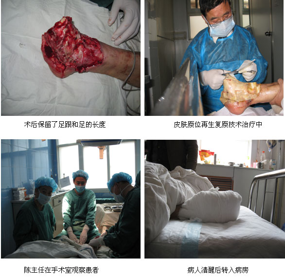 之后專家組與患者子女溝通,她們不同意截肢,要求用最好的技術(shù)、最小的損傷來治療母親疾病。根據(jù)家屬的要求,醫(yī)院決定應(yīng)用皮膚原位再生復(fù)原技術(shù)千方百計保住患者肢體,治療結(jié)果達(dá)到家屬滿意。在陳全喜主任的指導(dǎo)下,經(jīng)過二天的搶救,壞死組織被清除,病人蘇醒了。病人家屬握住陳主任的手說:是你們的技術(shù)救了我母親的命,保住了母親的一條腿呀。