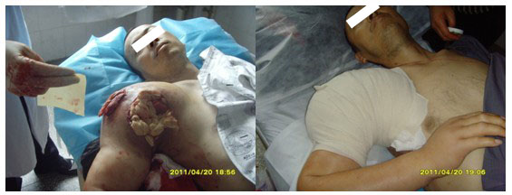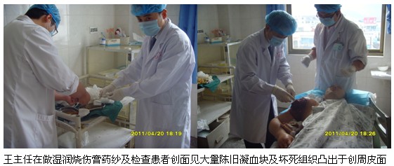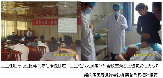 會(huì)后在腫瘤外科及醫(yī)務(wù)科姜主任的邀請(qǐng)下王主任來到了腫瘤外科為一位右上臂復(fù)發(fā)性皮膚纖維肉瘤患者會(huì)診,該患者在該醫(yī)院進(jìn)行了惡性腫瘤根治手術(shù)后發(fā)生局部轉(zhuǎn)移,后又到云南省某腫瘤醫(yī)院進(jìn)行了第二次腫瘤切除術(shù),但術(shù)后手術(shù)切口不愈并向周圍潰爛,創(chuàng)面惡化而且腫塊更大,每次換藥時(shí)創(chuàng)面出血不止,以至主管醫(yī)生不敢給患者創(chuàng)面進(jìn)行清創(chuàng)換藥,該醫(yī)院束手無策讓患者出院,王主任給患者查體時(shí)發(fā)現(xiàn)其整個(gè)右上臂高度腫脹,無法抬起,連頭都向右傾,患者非常痛苦,面色蒼白,經(jīng)初步檢查后王主任親自為患者進(jìn)行清創(chuàng)換藥,從患者創(chuàng)面中清除大量暗紫色陳舊凝血塊及大量液化壞死組織,創(chuàng)面周圍皮下組織完全液化壞死,形成巨大潛腔,部分皮膚因液化壞死組織未及時(shí)清除積聚皮下高度擴(kuò)張而發(fā)生散在性壞死并即將潰破,隨著大量壞死組織及陳舊凝血塊被清除,創(chuàng)面及創(chuàng)腔得到減壓,創(chuàng)面及潛腔放置美寶濕潤燒傷膏藥藥紗做引流清創(chuàng)及壓迫止血作用后創(chuàng)面出血及滲血停止,看著患者的表情由開始的痛楚逐漸變得輕松起來,把在場的醫(yī)護(hù)人員都看得目瞪口呆,對(duì)再生醫(yī)療技術(shù)贊不絕口。他們沒想到在權(quán)威的省腫瘤醫(yī)院那些專家們都無從下手又給推到他們的基層醫(yī)院,而運(yùn)用再生醫(yī)療技術(shù)在短短的一個(gè)多小時(shí)就解決了一換藥就出血,并把腫塊減到最小,讓患者如釋重負(fù)了。