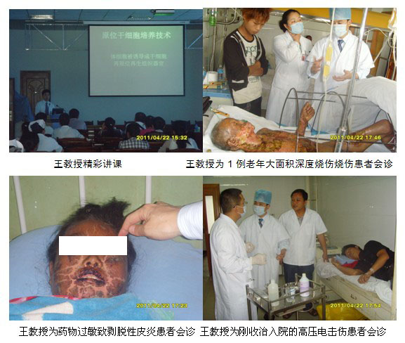 講座結(jié)束后,王主任首先應(yīng)該醫(yī)院急診科主任邀請到急診科為一名藥物過敏剝脫性皮炎患者會(huì)診,指導(dǎo)醫(yī)護(hù)人員怎樣處理創(chuàng)面,每次換藥的注意事項(xiàng)。而后又受胃腸及燒傷整形外科楊家成主任邀請,到該科為1例老年大面積深度燒傷患者會(huì)診,并為一名剛?cè)朐旱母邏弘姛齻颊邥?huì)診,指導(dǎo)醫(yī)護(hù)人員要盡早行創(chuàng)面切開減壓進(jìn)行有限清創(chuàng)術(shù),及手術(shù)的技巧和注意事項(xiàng),楊主任感激的握著王教授的手歡迎他日后多來該醫(yī)院現(xiàn)場指點(diǎn)工作。