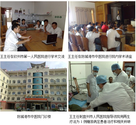 10月19日,王主任一行應(yīng)邀首先來的平南縣人民醫(yī)院,平南縣是廣西一人口大縣,全縣人口達一百二十萬人,平南縣人民醫(yī)院每年都會收治大量的燒傷病人和創(chuàng)瘍性病人。該院領(lǐng)導(dǎo)特別是副院長兼外科主任臧德源兼高對此次培訓(xùn)高度重視,王洪生主任應(yīng)邀于2009年10月19日下午2時30分,在該院以《再生療法在燒傷及難治性創(chuàng)傷.潰瘍創(chuàng)面治療新進展》及《燒傷皮膚原位復(fù)原技術(shù)臨床規(guī)范化應(yīng)用及大面積燒傷全身治療要點》進行了專題講座;10月20日,王洪生主任一行應(yīng)貴港市中醫(yī)院院長韋赤勇和副院長李超章之邀,對該院1例糖尿病足、1例褥瘡和1例開放性骨折內(nèi)固定術(shù)后切口皮膚壞死、鋼板及骨外露患者分別進行會診及跟蹤臨床指導(dǎo),并利用在骨科及創(chuàng)傷外科查房的間隙,應(yīng)韋赤勇院長和副院長李超章的邀請,王主任對包括該院骨科、創(chuàng)傷外科主任、副主任在內(nèi)的相關(guān)專家和醫(yī)生進行了《再生療法在難治性創(chuàng)傷.潰瘍創(chuàng)面治療新進展》科室臨床技術(shù)培訓(xùn);10月21日,王洪生主任應(yīng)欽州市第一人民醫(yī)院副院長兼普外科主任李鋒主任醫(yī)師之邀,對該院燒傷整形科醫(yī)生及內(nèi)分泌科主任進行了一期《再生療法在難治性創(chuàng)傷潰瘍創(chuàng)面治療新進展》科室臨床技術(shù)培訓(xùn)和科室查房,在欽州市第一人民醫(yī)院進行臨床學(xué)術(shù)交流期間,王主任還與李鋒副院長就該院進行的針式內(nèi)鏡甲狀腺切除術(shù)手術(shù)創(chuàng)口應(yīng)用美寶創(chuàng)面速愈貼預(yù)防內(nèi)鏡創(chuàng)口術(shù)后增生性瘢痕進行科研協(xié)作達成有關(guān)意向;10月22日,王洪生主任應(yīng)防城港市中醫(yī)院院長徐奎、院長助理兼外科主任陳國峰及大外科主任莫志和主任之邀,在該院以《再生療法在燒傷及難治性創(chuàng)傷潰瘍創(chuàng)面治療新進展》為題進行了專題學(xué)術(shù)講座,在講課間隙還對該院一個褥瘡病人進行會診;10月23日,王洪生主任應(yīng)宜州市人民醫(yī)院院長兼微創(chuàng)外科治療中心主任黃仲海副主任醫(yī)師的邀請,為該院1例糖尿病足患者進行會診和指導(dǎo)該院進行再生療法在糖尿病足的臨床療效觀察科研項目,在宜州市人民醫(yī)院期間,黃仲海院長還組織該院骨科、燒傷整形科、普外科、創(chuàng)傷外科微創(chuàng)外科(腹腔鏡、宮腔鏡、輸尿管鏡)治療中心、手術(shù)室、麻醉科的全體專家和醫(yī)護人員就再生療法在燒傷及難治性創(chuàng)傷潰瘍創(chuàng)面治療新進展及美寶創(chuàng)面速愈貼預(yù)防手術(shù)切口增生性瘢痕等專題進行了臨床學(xué)術(shù)交流,并就該院新近成立的微創(chuàng)外科治療中心應(yīng)用美寶創(chuàng)面速愈貼預(yù)防內(nèi)鏡創(chuàng)口術(shù)后增生性瘢痕開展科研協(xié)作達成共識。