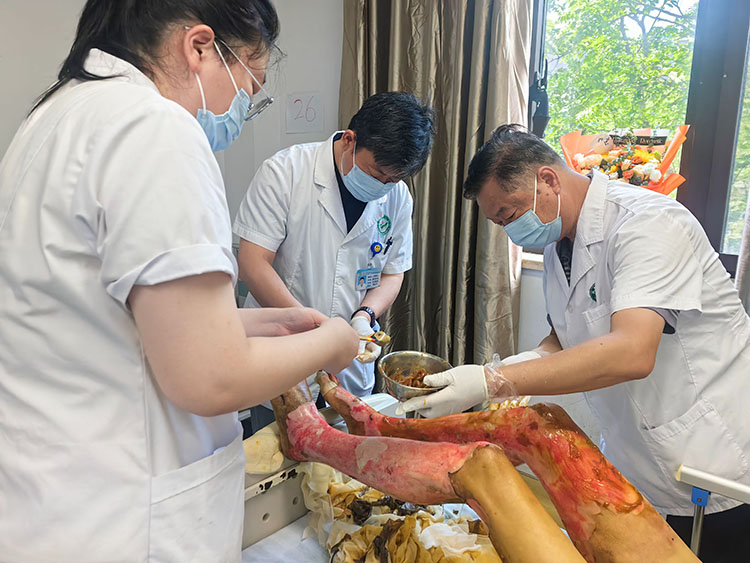 2025年7月8日,中國燒傷創(chuàng)瘍雜志編委,燒傷創(chuàng)瘍再生醫(yī)療技術(shù)臨床專家張強,應(yīng)邀前往鳳陽縣人民醫(yī)院,對一例40%多的大面積燒傷病人和一例糖尿病足患者進行臨床會診,張強主任親自示范再生醫(yī)療技術(shù)創(chuàng)面清創(chuàng)換藥流程,強調(diào)了換藥過程中的注意事項,并與蔣主任交流了綜合治療方案,再生醫(yī)療技術(shù)是中西醫(yī)結(jié)合創(chuàng)面治療的典范,其推廣應(yīng)用將極大造福燒傷及慢性創(chuàng)面患者。