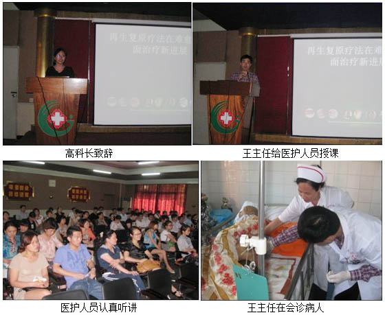 2012年4月13日上午,應(yīng)廣東省農(nóng)墾中心醫(yī)院之邀,中國(guó)中西醫(yī)結(jié)合學(xué)會(huì)燒傷專業(yè)委員會(huì)常委兼秘書(shū)、《中國(guó)燒傷創(chuàng)瘍雜志》副總編輯、北京美寶燒傷創(chuàng)瘍研究所副所長(zhǎng)、第二臨床研究部主任王洪生研究員到醫(yī)院做“再生復(fù)原療法在深度燒傷及難愈性創(chuàng)面治療新進(jìn)展”專題學(xué)術(shù)講座。廣東省農(nóng)墾中心醫(yī)院全院的醫(yī)護(hù)人員均參加了此次培訓(xùn),在學(xué)術(shù)講座中,王主任首先向與會(huì)的專家介紹了著名生命科學(xué)家、醫(yī)學(xué)家、人體再生復(fù)原科學(xué)的創(chuàng)立者、再生復(fù)原療法的發(fā)明人徐榮祥教授近年來(lái)在再生醫(yī)學(xué)領(lǐng)域所取得的重大實(shí)驗(yàn)及臨床研究成果,而后王主任結(jié)合了大量的臨床病例圖片及錄像資料,主要針對(duì)深度燒傷及各類難愈性創(chuàng)傷、潰瘍創(chuàng)面的規(guī)范化處理方法與技巧、注意事項(xiàng)等進(jìn)行了細(xì)致地講解,在座的各位醫(yī)護(hù)均被這神奇的療法折服。會(huì)后,醫(yī)護(hù)人員向王主任詢問(wèn)了臨床上所遇到的問(wèn)題,王主任一一作了詳細(xì)解答。該醫(yī)院醫(yī)務(wù)科高科長(zhǎng)作總結(jié)發(fā)言時(shí),高度贊揚(yáng)了再生復(fù)原療法,稱之為一種為患者帶來(lái)福音的一種療法。隨后,應(yīng)高科長(zhǎng)和老年科護(hù)長(zhǎng)的邀請(qǐng),王主任親自到老年科對(duì)一名深度褥瘡患者進(jìn)行了會(huì)診,并提出治療建議。