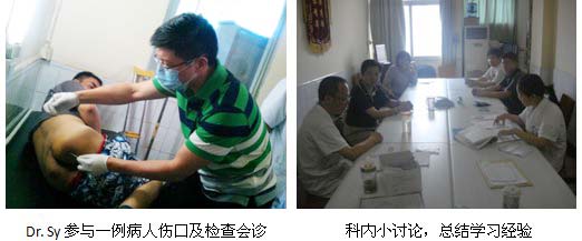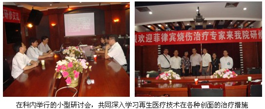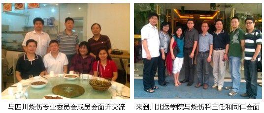 2011年6月19日至7月2日,菲律賓兩名高年資燒傷整形科專家,Dr. Mijares及Dr. Sy分別來到中國中西醫(yī)結合學會基地醫(yī)院:四川省南充市川北醫(yī)學院附屬醫(yī)院及雅安市人民醫(yī)院進行參觀學習再生醫(yī)療技術,中國中西醫(yī)結合學會燒傷專業(yè)委員會四川分會的胡棟材教授,邱為東秘書長,川北醫(yī)學院附屬醫(yī)院燒傷科主任周國富教授,雅安市人民醫(yī)院燒傷科主任兼燒傷專業(yè)委員會副主任委員付子俊教授熱烈歡迎并進行了大量的學術指導和生活。中國中西醫(yī)結合學會燒傷專業(yè)委員會對外辦公室舒葉陪同翻譯。