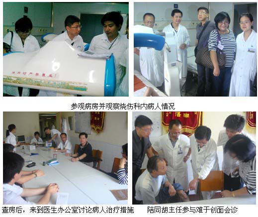 2011年6月20日至6月24日,兩名國外專家在南充市川北醫(yī)學院附屬醫(yī)院燒傷科參觀學習。其間,在周國富主任醫(yī)師,項曉燕主治醫(yī)師,陳剛主治醫(yī)師及其他科內(nèi)醫(yī)護人員的帶領下,外國專家每天到病 房觀察燒傷病人創(chuàng)面在再生醫(yī)療技術的幫助下,如何一天天原位再生復原;同時,為了更好的達到此次學習目的,在科內(nèi)專門組織了數(shù)次科內(nèi)的小型討論會,專門對大面積燒傷患者系統(tǒng)治療方面如何進行補液,抗感染等要點作了深入的研討;通過深入回顧科內(nèi)年初成功搶救的一例大面積燒傷患者的病歷資料,國外專家對系統(tǒng)治療的要點有了深刻的把握,尤其是與傳統(tǒng)方法的區(qū)別。