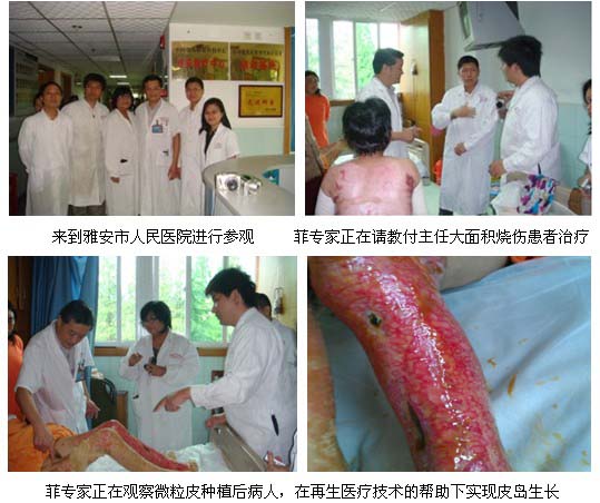 2011年6月27日至7月2日,兩名專家來到雅安市人民醫(yī)院燒傷科進行學習再生醫(yī)療在介紹了微粒皮種植的流程;其間有一例患者正從微粒皮種植的手術中逐漸恢復,傷口上生長的皮島正在連接成片。付主任解釋說,如果按照傳統(tǒng)的方法換藥,種植的微粒皮是不可能在創(chuàng)面上存活并且生成皮島,正是有了再生醫(yī)學技術獨有的干細胞培養(yǎng)過程,才使得微粒皮種植培養(yǎng)皮島得以實現(xiàn)。此外,除了燒傷病人,各種外傷及慢性創(chuàng)面患者也都在再生醫(yī)療技術的幫助下獲得了良好的治療和康復。Dr. Mijares盡管只有一年再生醫(yī)療技術的使用經(jīng)驗,但仍然驚訝于再生醫(yī)療技術在多學科應用所取得的成就并且表示回國后將致力于再生醫(yī)學在菲律賓的發(fā)展。