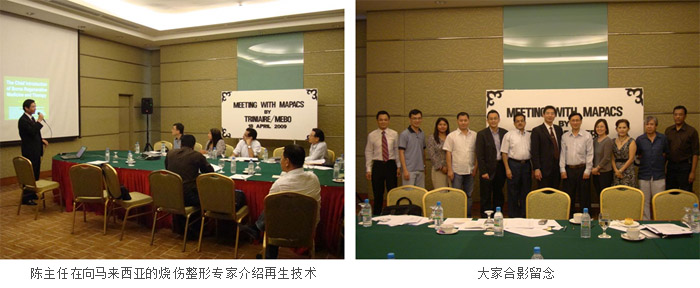 2009年4月18日,馬來西亞2009年燒傷整形外科常務(wù)委員會議在吉隆坡Boulevard Hotel召開,參加會議的有來自各州、省、市的重要的燒傷、整形專家約15人。陳永翀主任應(yīng)邀參加會議,并以“The chief introduction of burns regenerative medicine and therapy”為題進行專題報告,在陳主任的30分鐘的演講中,向各位燒傷整形專家闡述了全厚皮燒傷通過激活潛能再生細胞轉(zhuǎn)化為干細胞,然后利用干細胞培養(yǎng)再生技術(shù)實現(xiàn)原位再生復原皮膚器官的過程,同時向大家展示了眾多的大面積特重度燒傷的臨床病例,大家聽后非常興奮和激動,各位專家爭先恐后地舉手提問,陳主任和助手們則逐一進行解答,大家還紛紛詢問何時能夠買到MEBO和引進該技術(shù),提問和討論階段占了1個半小時。最后,燒傷學會主席Dr. Peter Wong向陳永翀主任發(fā)出邀請,邀請陳主任出席2010由馬來西亞燒傷學會主辦的在馬來西亞Kuching市召開的亞洲燒傷整形大會并做專題演講。