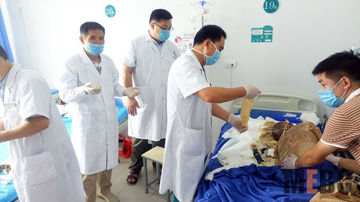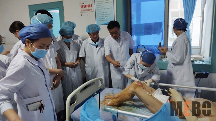 7月17日,受商丘市睢陽區(qū)中心醫(yī)院邀請,中國中西醫(yī)結(jié)合學(xué)會燒傷專業(yè)委員會委員、燒傷創(chuàng)瘍再生醫(yī)療技術(shù)資深專家、河南大學(xué)第一附屬醫(yī)院燒傷科主任醫(yī)師李繼洋教授到院會診,指導(dǎo)一例大面積重度燒傷患者的治療?;颊吣杲攀瑹齻娣e30%以上,大部分為深二度和三度燒傷。李繼洋教授翻閱病人病例,聽取病人目前情況,觀察患者頭面部、雙上肢及后背的燒傷創(chuàng)面,高度評價抗休克治療,肯定了馬文博主任帶領(lǐng)的外科團隊運用原位再生醫(yī)療技術(shù)(MEBT/MEBO)在該病例的規(guī)范治療取得的階段性成就,然后示范指導(dǎo)各燒傷部位創(chuàng)面耕耘、薄化的操作技巧,并對壞死組織給出了分期分批處理的意見。通過本次會診活動,商丘市睢陽區(qū)中心醫(yī)院綜合外科掌握了更多大面積重度燒傷患者的治療知識,為更好運用原位再生醫(yī)療技術(shù)救治商丘市區(qū)及周邊燒傷患者積累了更多的寶貴實戰(zhàn)經(jīng)驗。