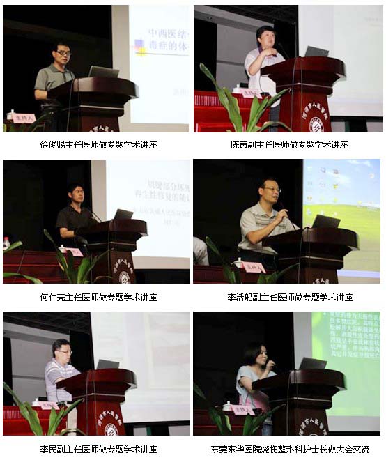 王洪生研究員首先以“燒傷皮膚原位再生復(fù)原技術(shù)在重度以上燒傷系統(tǒng)治療的要點(diǎn)”為題進(jìn)行了專題學(xué)術(shù)講座;隨后,唐乾利教授講解了“皮膚潰瘍創(chuàng)面處理的中西醫(yī)基礎(chǔ)與臨床研究近況”;王達(dá)利教授講授了“瘢痕疙瘩來(lái)源干細(xì)胞的生物學(xué)特性鑒定”;賀全勇教授講授了“燒傷感染的防治”;譚軍教授講授了“點(diǎn)陣激光治療增生性瘢痕”;張一鳴教授講授了“燒傷瘢痕的外科治療”; 省內(nèi)專家廣東省中西醫(yī)結(jié)合學(xué)會(huì)燒傷專業(yè)委會(huì)副主任委員、中山大學(xué)附屬五院燒傷整形科主任辛儉副主任醫(yī)師;廣東省中西醫(yī)結(jié)合學(xué)會(huì)燒傷專委會(huì)副主任委員、深圳陽(yáng)光醫(yī)院院長(zhǎng)張華彬主任醫(yī)師;廣東省中西醫(yī)結(jié)合學(xué)會(huì)燒傷專委會(huì)副主任委員、深圳市第六人民醫(yī)院梁智主任醫(yī)師;廣東省中西醫(yī)結(jié)合學(xué)會(huì)燒傷專委會(huì)副主任委員、廣東醫(yī)學(xué)院附屬惠州醫(yī)院(惠州市中心醫(yī)院)燒傷整形科主任徐俊賜主任醫(yī)師;廣東省中西醫(yī)結(jié)合學(xué)會(huì)燒傷專業(yè)委員會(huì)常委、深圳市龍崗中心醫(yī)院燒傷整形科主任陳茵副主任醫(yī)師;廣東省中西醫(yī)結(jié)合學(xué)會(huì)燒傷專業(yè)委員會(huì)委員、佛山南海人民醫(yī)院燒傷整形科主任李民副主任醫(yī)師;廣東省中西醫(yī)結(jié)合學(xué)會(huì)燒傷專業(yè)委員會(huì)常委兼秘書(shū)、中山黃圃人民醫(yī)院皮膚與燒傷創(chuàng)瘍科主任何仁亮主任醫(yī)師;廣東省中西醫(yī)結(jié)合學(xué)會(huì)燒傷專業(yè)委員會(huì)常委、開(kāi)平市婦幼保健院院長(zhǎng)李活船副主任醫(yī)師分別以“小兒重度燒傷治療”、“皮膚擴(kuò)張技術(shù)在燒傷瘢痕中的運(yùn)用”、“皮膚圓錐體結(jié)構(gòu)的病理學(xué)觀察”、“皮膚微粒皮種植修復(fù)大面積燒傷創(chuàng)面”、“中西醫(yī)治療燒傷膿毒癥”為題進(jìn)行了專題講座。在學(xué)術(shù)講座中來(lái)自國(guó)內(nèi)各省的專家利用大量詳實(shí)的圖片資料,重點(diǎn)向與會(huì)的專家、學(xué)者和醫(yī)護(hù)人員講述了燒傷皮膚原位再生復(fù)原醫(yī)療技術(shù)等中西醫(yī)結(jié)合方法在特重度燒傷并發(fā)癥及增生性瘢痕防治方面的進(jìn)展,由于學(xué)術(shù)講座重點(diǎn)突出、內(nèi)容豐富、貼近臨床,方法簡(jiǎn)便實(shí)用、臨床效果顯著,與會(huì)代表反映強(qiáng)烈。學(xué)習(xí)班結(jié)束后,學(xué)員們進(jìn)行了廣泛而深入地交流。