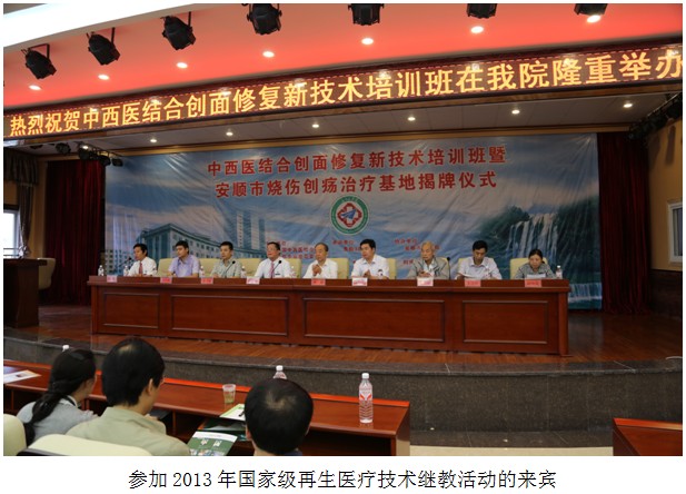 2013年5月31日,由國家中醫(yī)藥管理局批準(zhǔn)、中國中西醫(yī)結(jié)合學(xué)會燒傷專業(yè)委員會主辦的2013年國家級繼教項(xiàng)目《中國中西醫(yī)結(jié)合創(chuàng)面修復(fù)新技術(shù)培訓(xùn)》暨安順市燒傷創(chuàng)瘍治療基地揭牌儀式在中航工業(yè)貴航302醫(yī)院舉行,這項(xiàng)活動由貴航302醫(yī)院承辦,安順市衛(wèi)生局協(xié)辦。來自全國各省市142名專家及醫(yī)務(wù)工作者到會參加學(xué)習(xí)。本次會議由貴航302醫(yī)院周書記主持,參加會議的專家和來賓有中國中西醫(yī)結(jié)合學(xué)會燒傷專業(yè)委員會主任委員肖摩教授、中國燒傷創(chuàng)瘍雜志社副總編輯王洪生研究員、中國中西醫(yī)結(jié)合學(xué)會燒傷專業(yè)委員會副主任委員、廣西右江民族醫(yī)學(xué)院副校長唐乾利教授、中國中西醫(yī)結(jié)合學(xué)會燒傷專業(yè)委員會副主任委員、遵義醫(yī)學(xué)院附屬醫(yī)院副院長王達(dá)利教授、福建中醫(yī)藥大學(xué)附屬福建省人民醫(yī)院重癥醫(yī)學(xué)科鄭文賀副教授、貴州省中西醫(yī)結(jié)合學(xué)會李志偉秘書長、安順市衛(wèi)生局張曉霞副局長、貴航302醫(yī)院陳志堅(jiān)院長等。