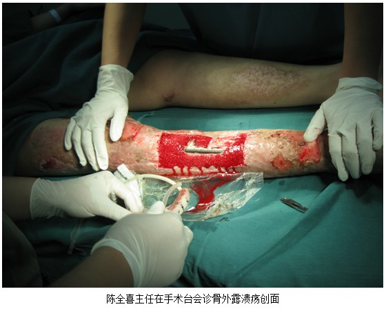 皮膚原位再生醫(yī)療技術(shù)培訓(xùn)班在三門峽市中醫(yī)院剛剛結(jié)束,該院骨四科羅主任邀請中國中西醫(yī)結(jié)合學(xué)會燒傷專業(yè)委員會委員、北京美寶燒傷創(chuàng)瘍研究所臨床部主任陳全喜,到醫(yī)院會診右下肢脛骨粉碎性骨折已近70天傷口不愈合的骨病患者。