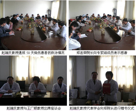 最后,趙瑞慶教授還代表了中國中西醫(yī)結(jié)合學(xué)會燒傷專業(yè)委員會、北京燒傷創(chuàng)瘍研究所、中國燒傷創(chuàng)瘍雜志社向鄭連榮院長贈送了《燒傷治療大全》一部,會后趙瑞慶教授與王廣順教授一同看望了患者及患者家屬。