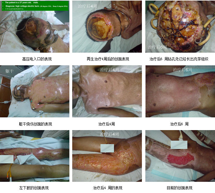 患者入院后,外科主任和醫(yī)師們根據(jù)患者的病情和再生技術(shù)的優(yōu)勢(shì),經(jīng)過討論后,決定選擇燒傷皮膚原位再生技術(shù)進(jìn)行治療。在搶救和治療期間,主管醫(yī)師Dr.Roys和北京中國燒傷創(chuàng)瘍科技中心的臨床專家陳永翀教授積極聯(lián)系,陳教授則通過E-mail對(duì)印尼方面的醫(yī)師進(jìn)行了技術(shù)指導(dǎo)。由于萬隆市的R.S Immanuel Hospital醫(yī)院的醫(yī)師們規(guī)范采用了再生醫(yī)學(xué)技術(shù)對(duì)患者進(jìn)行全身系統(tǒng)治療和創(chuàng)面的耕耘處理,使患者安全度過了休克期,創(chuàng)面得到了很好的保護(hù)和挽救。目前,深I(lǐng)I度和淺III度創(chuàng)面均已愈合,深I(lǐng)II度的創(chuàng)面也呈現(xiàn)出良好的生長(zhǎng)情況,顱骨裸露的創(chuàng)面已經(jīng)進(jìn)行了第2次鉆孔并埋置了擴(kuò)張器,鉆孔的地方已經(jīng)生長(zhǎng)出新的肉芽組織,預(yù)計(jì)大約1個(gè)月可以完全封閉創(chuàng)面。以下是部分病例資料相片。