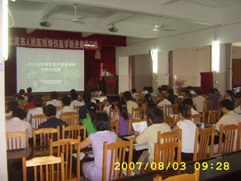 開幕式結(jié)束后,學(xué)術(shù)講座開始,王洪生主任采用多媒體教學(xué)方式,利用大量詳實的圖片資料,一是重點向與會的醫(yī)護(hù)人員講述了燒傷發(fā)展史及國內(nèi)外燒傷治療現(xiàn)狀,同時重點講述了了我國著名生命科學(xué)家,醫(yī)學(xué)家徐榮祥教授近年來在生命再生科學(xué)及燒傷再生醫(yī)學(xué)領(lǐng)域所取得的研究新進(jìn)展和重大實驗和臨床研究成果;并通報了徐榮祥教授在生命科學(xué)研究領(lǐng)域于2005年12月6日在美國獲得的三大發(fā)明專利;二是重點講述了燒傷皮膚原位再生醫(yī)療技術(shù)在燒傷臨床中的規(guī)范化應(yīng)用;三是重點講述了燒傷皮膚原位再生醫(yī)療技術(shù)在多學(xué)科的臨床應(yīng)用。學(xué)術(shù)講座結(jié)束前,還進(jìn)行了互動式大會交流及提問,王洪生主任對學(xué)員提出的問題一一進(jìn)行了解答。