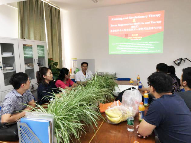 9月11日上午,蒙古來訪專家一行來到燒傷創(chuàng)瘍科病房區(qū)參觀交流,參觀了再生醫(yī)學(xué)療法治療糖尿病足、褥瘡、癌性創(chuàng)面及兩例85%以上的大面積燒傷患者在內(nèi)共三十多位患者的治療情況。隨后去門診了解門診患者的病情及就診情況。下午,陳永翀教授在會議室以課件形式給來訪專家們講解了再生醫(yī)學(xué)療法的操作規(guī)范及多病種病例,雙方就技術(shù)應(yīng)用進行了深入的交流。