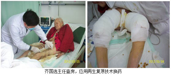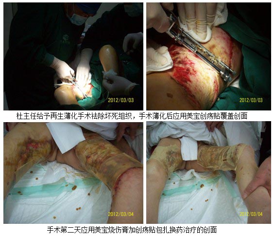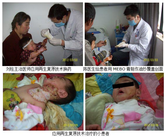 2011年11月14日~17日,杜福勤主任再次來(lái)到燒傷整形科,在齊國(guó)選主任的帶領(lǐng)下看望了住院的燒傷和整形患者,并給予再生技術(shù)規(guī)范換藥。15日給予示范換藥治療后,得到患者及家屬的認(rèn)可和歡迎,特別是幼兒患者,應(yīng)用再生技術(shù)換藥后患兒立即停止哭鬧。16日,應(yīng)用MEBO創(chuàng)瘍貼給頸胸部燙傷患兒和上下肢燒傷植過(guò)自體皮的患兒換藥治療,收到了良好的臨床效果。