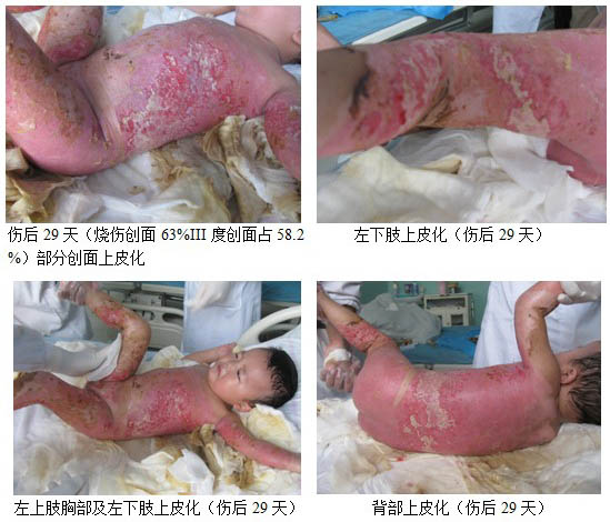 患者李某某, 2歲,安微阜陽人。小兒墜入鍋內沸水中,全身燙傷總面積63%,II度深型占4.8%,III度淺型占58.2%,傷后29天,在人體皮膚原位再生醫(yī)療技術規(guī)范治療下創(chuàng)面60%已上皮化。創(chuàng)面按照皮膚的生理性愈合的規(guī)律進行生理性愈合。