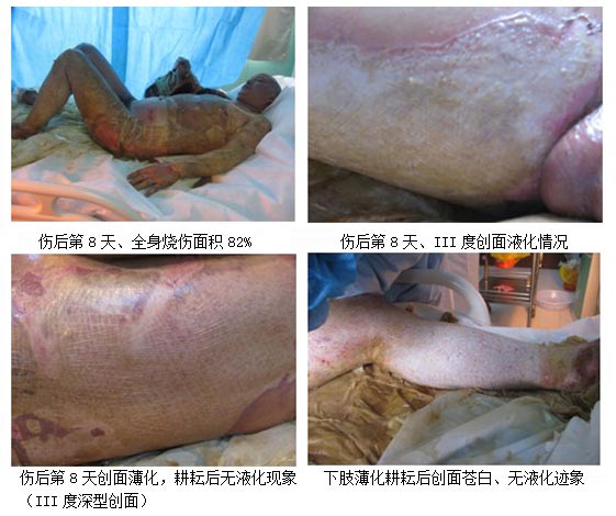 上期報導金某某,男,46歲,強堿水燒傷了全身,全身燒傷面積占80%,順利度過了休克期。傷后第8天在人體皮膚原位再生技術規(guī)范治療下,II度深型創(chuàng)面占3%已開始液化,III度淺型18%創(chuàng)面開始液化,III度深型創(chuàng)面薄化耕耘呈白色皮革樣,無液化跡象。