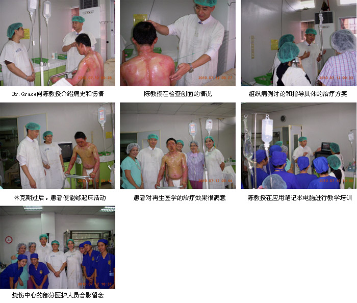 7、7月12日上午9時,陳教授一行再次應邀來到了Jose R. Reyes Medical Center ( 政府醫(yī)院,燒傷中心有6張病床,2007年引進燒傷再生醫(yī)學技術)進行大面積特重度燒傷病人的會診和臨床指導。這是一位男性患者,37歲,被火焰燒傷全身多處30分鐘,于3天前收入院。臨床診斷:大面積特重度燒傷65%TBSA (深II度25%,淺II度40%),合并輕度吸入性損傷。由于該患者傷后較快來到了燒傷中心并接受了規(guī)范的燒傷再生醫(yī)學技術的治療,目前患者各方面情況良好,生命體征穩(wěn)定,沒有感染的表現(xiàn),已經停止使用抗生素,淺II度創(chuàng)面在逐步愈合,深II度創(chuàng)面順利進入到液化期。醫(yī)師、患者和家屬對再生醫(yī)學的治療效果和取得良好進展都感到很滿意。