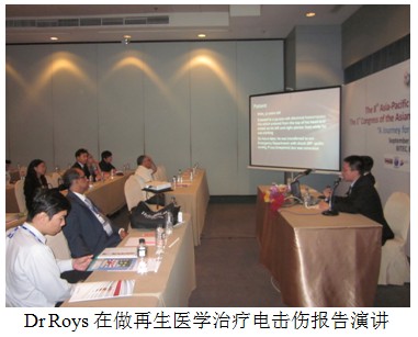 第三位演講者是來自印尼的Dr. Roys A. Pangajoman, 他也是實踐美寶再生療法的資深醫(yī)生了,曾經(jīng)發(fā)表了一篇應(yīng)用美寶治療電擊傷的臨床論文,這次他的演講內(nèi)容便是針對一例顱骨嚴重電擊傷的成功案例。他將運用再生醫(yī)學療法對此例電擊傷患者治療的詳盡過程跟蹤圖片資料,病人創(chuàng)面的處理演示及愈合情況,生動、客觀地展示給了與會的聽眾,雖然只是一個病例的展示,但是基于他的病例的嚴重程度、典型性,以及再生療法在整個治療中顯示出的優(yōu)勢,都使在場的聽眾為止贊嘆并紛紛提問。