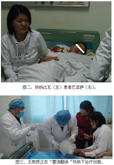 由于親戚臨時(shí)有事沒來,母子二人為了保住巴亞薩凍傷的腳,從蒙古國不遠(yuǎn)千里來看病。大家只知道躺在病床上的小伙子名叫巴亞薩,20歲,右腳部被嚴(yán)重凍傷14天,腳趾頭變黑。初時(shí)只見蒙古國小伙的右腳纏著厚厚的紗布繃帶,旁邊的紙上寫著他的名字(BAYASAA)。當(dāng)王教授問他問題時(shí),他只能用迷惑和搖頭來回答。由于語言不通,巴亞薩喊疼時(shí)大家都聽不懂。他們出去買點(diǎn)食物都得給親戚打電話問清楚才能出去買。在“診療計(jì)劃”也無法告知患者的難題下,王教授和醫(yī)生求助了電視臺(tái)、報(bào)紙等媒體向社會(huì)征集蒙古語翻譯的志愿者,好解決和患者的交流問題。