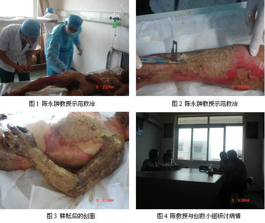 2007年6月5日貴州省安順市基地醫(yī)院收治了四名大面積重度燒傷病人,由于病情嚴重,情況緊急,該院立即通知了中國中西醫(yī)結合學會燒傷專業(yè)委員會陳永翀教授,陳教授聞之情況后,于第二天就從北京趕到了該院,到達該院后陳教授立即投入到了搶救的工作中去了。