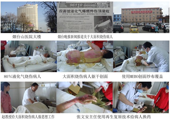煙臺(tái)山醫(yī)院燒傷整形科曾在2011年10月份在張文安主任的帶領(lǐng)下使用再生復(fù)原技術(shù)治療一例85%大面積燒傷病人獲得成功。此例80%液化氣燒傷病人剛送到醫(yī)院,血壓下降,張文安主任沉著應(yīng)戰(zhàn)雙通道液體輸入抗休克搶救,并早期進(jìn)行簡易清創(chuàng)后創(chuàng)面用MEBO覆蓋(因病人信仰伊斯蘭教)。在第一時(shí)間北京燒傷創(chuàng)瘍研究所趙瑞慶教授也趕到搶救現(xiàn)場指導(dǎo)進(jìn)一步治療。