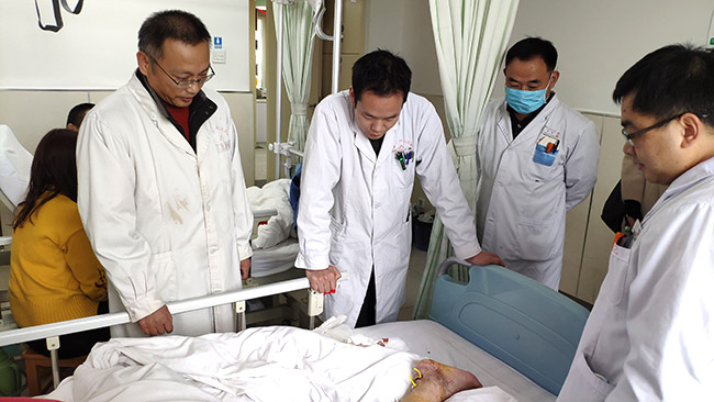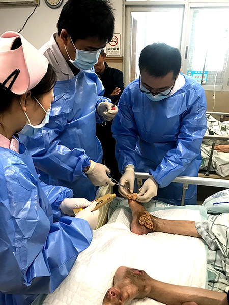 3月8日上午,北京榮祥再生醫(yī)學研究所副所長、中國中西醫(yī)結(jié)合學會燒傷專業(yè)委員會常務(wù)委員、《燒傷創(chuàng)瘍雜志》副總編輯、應(yīng)用燒傷創(chuàng)瘍再生醫(yī)療技術(shù)治療糖尿病足領(lǐng)域?qū)<?、研究員王洪生主任應(yīng)邀到南方醫(yī)科大學附屬南海醫(yī)院燒傷整形科會診一例重度雙下肢痛風潰瘍患者,并對年輕醫(yī)生進行臨床教學示范。