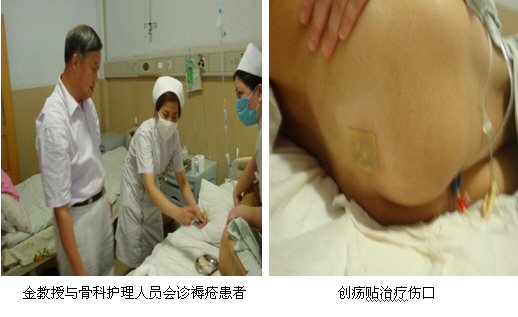 三峽大學(xué)仁和醫(yī)院內(nèi)一科是神經(jīng)內(nèi)科,呼吸內(nèi)科和理化中毒的大科,該院郝巧蓉護(hù)士長(zhǎng)和陳慧敏醫(yī)生熱情地接待了金教授。近期,該科接診了一位淋巴結(jié)核創(chuàng)面的老年患者,該患之前在外科住院兩個(gè)月,考慮到患者的年齡較大,醫(yī)生未對(duì)該患施行手術(shù)。目前該患的創(chuàng)面,未有大量分泌物滲出,竇道已封閉。該院在為該患治療時(shí),曾用過安福消炎膏,龍血竭粉外敷于創(chuàng)面,效果不理想,后改用美寶創(chuàng)瘍貼和濕潤(rùn)燒傷膏換藥已有一個(gè)多月。金教授仔細(xì)查看了該患創(chuàng)面,創(chuàng)面有供血,但無(wú)滲液,金教授建議患者的主治醫(yī)生繼續(xù)使用美寶創(chuàng)瘍貼和濕潤(rùn)燒傷膏聯(lián)合換藥,并講解了換藥時(shí)的注意事項(xiàng)。
