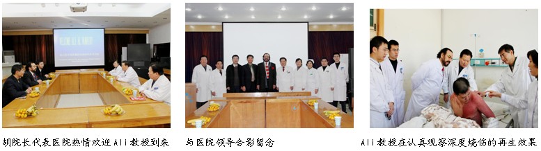 17日上午9時(shí),Dr. Ali在中國(guó)燒傷創(chuàng)瘍科技中心臨床部陳永翀主任和醫(yī)學(xué)英語(yǔ)專業(yè)翻譯張印的陪同下來(lái)到了泰山醫(yī)學(xué)院附屬醫(yī)院,醫(yī)院業(yè)務(wù)副院長(zhǎng)胡建功教授和醫(yī)務(wù)處楊曉雯處長(zhǎng)在醫(yī)院的多功能廳舉辦了簡(jiǎn)短的歡迎儀式,熱情歡迎Dr.Ali來(lái)到泰山醫(yī)學(xué)院附屬醫(yī)院進(jìn)行參觀考察和學(xué)術(shù)交流。歡迎儀式結(jié)束后,按照原定計(jì)劃,Dr.Ali在燒傷科徐西勝主任和護(hù)士長(zhǎng)的帶領(lǐng)下參觀考察了燒傷科病房及住院處的各種燒傷、創(chuàng)瘍患者的治療情況,目前燒傷科住院患者有26名,其中大面積燒傷有7名。Dr.Ali重點(diǎn)參加了5例大面積燒傷患者的不同治療階段的查房和病例討論,還觀摩了為2例大面積燒傷患者示范換藥的過(guò)程。在病房的參觀考察過(guò)程中,Dr.Ali一直都非常興奮和激動(dòng),他不停地向患者和家屬打招呼,不停地提問(wèn)、拍照和檢查再生愈合后的皮膚質(zhì)量,Dr.Ali感慨地講道,他曾經(jīng)到過(guò)美國(guó)和歐洲的世界上最好的燒傷中心參觀和考察,雖然他們的病房條件很好,但住院燒傷患者的救治成活率還達(dá)不到70%,而且在那里患者與家人被無(wú)情地分開(kāi),單獨(dú)隔離到一個(gè)完全陌生和封閉的環(huán)境里,他所見(jiàn)到的患者都是神情緊張、目光呆滯或情緒低落,患者每天都在驚恐中度日如年。今天,Dr.Ali看到采用燒傷再生醫(yī)學(xué)技術(shù)治療的大面積深度燒傷患者卻能夠在普通、開(kāi)放的病房里接受治療,在這里所看到的患者都是神情自若、精神飽滿、情緒穩(wěn)定、能吃、能動(dòng)、能睡,還能夠和家人、朋友進(jìn)行交談,換藥中還能夠配合醫(yī)師進(jìn)行翻身、抬腿等,而且整個(gè)病區(qū)沒(méi)有發(fā)現(xiàn)1例創(chuàng)面感染的患者。Dr.Ali 忍不住驚呼:燒傷再生醫(yī)學(xué)技術(shù)太神奇了!中國(guó)的燒傷醫(yī)師、護(hù)士太偉大了。