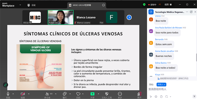 在專題研討環(huán)節(jié),美寶國際技術(shù)部講師杜鈺涵進行了深度學(xué)術(shù)分享,從流行病學(xué)特征、病理生理機制、國際診斷標準到再生醫(yī)療技術(shù)的作用機理與臨床適應(yīng)癥,全方位構(gòu)建了靜脈潰瘍的防治知識體系。特別針對聯(lián)合治療方案優(yōu)化、典型病例分析及長期預(yù)防策略等臨床痛點,提供了基于循證醫(yī)學(xué)的解決方案。參會人員有來自巴西、秘魯、哥斯達黎加等不同拉美國家的醫(yī)生和學(xué)者們多達130人,大家在會議期間踴躍提問,諸如在應(yīng)用再生醫(yī)療技術(shù)期間對于傷口恢復(fù)的作用、慢性創(chuàng)面的病因與再生醫(yī)療技術(shù)的作用機制,慢性創(chuàng)面多病因分析與個體化治療策略等,提出的問題得到逐一解答,獲得與會者一致好評?,F(xiàn)場互動熱烈,充分展現(xiàn)了再生醫(yī)療技術(shù)在慢性創(chuàng)面治療領(lǐng)域的突破性價值與國際認可度。