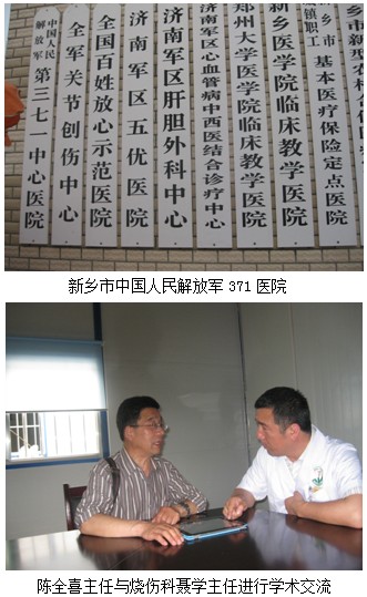 2012年5月10日晚,河南新鄉(xiāng)市中國(guó)人民解放軍371醫(yī)院燒傷科主任聶學(xué)邀請(qǐng)北京美寶燒傷創(chuàng)瘍研究所臨床部專家陳全喜主任進(jìn)行學(xué)術(shù)交流,業(yè)務(wù)員楊志強(qiáng)隨行。