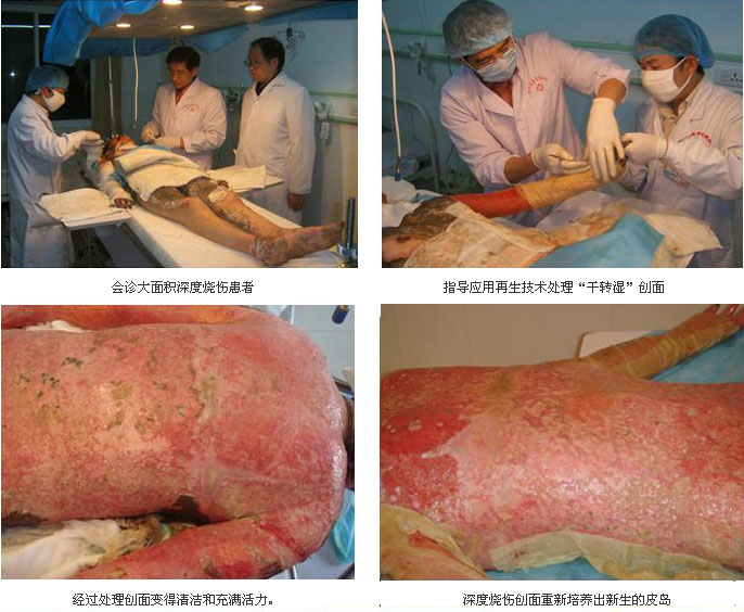 擴大燒傷再生醫(yī)學的學術影響。2007年3月19日,在商洛市中醫(yī)醫(yī)院舉辦了“再生醫(yī)學與燒傷皮膚再生技術”培訓班,通過學習大家對燒傷皮膚再生技術在大面積深度燒傷的救治上有了更深的認識和了解。培訓班結(jié)束后,醫(yī)院邀請前來講課的陳永翀副所長到燒傷科進行查房,重點討論和制定了采用燒傷皮膚再生技術治療傳統(tǒng)干燥結(jié)痂的大面積燒傷患者的治療方案。該患者是前段時間從西安軍醫(yī)大某附屬醫(yī)院轉(zhuǎn)回來的,轉(zhuǎn)入診斷:1、大面積特重度燒傷干燥保痂治療后(TBSA=85%,III度65%);2、吸入性損傷氣管切開術后;3、低蛋白血癥。經(jīng)過討論,大家一致同意選擇和改用治療痛苦小、能促進創(chuàng)面愈合、費用低、能減少瘢痕和殘疾的燒傷皮膚再生技術給患者治療。