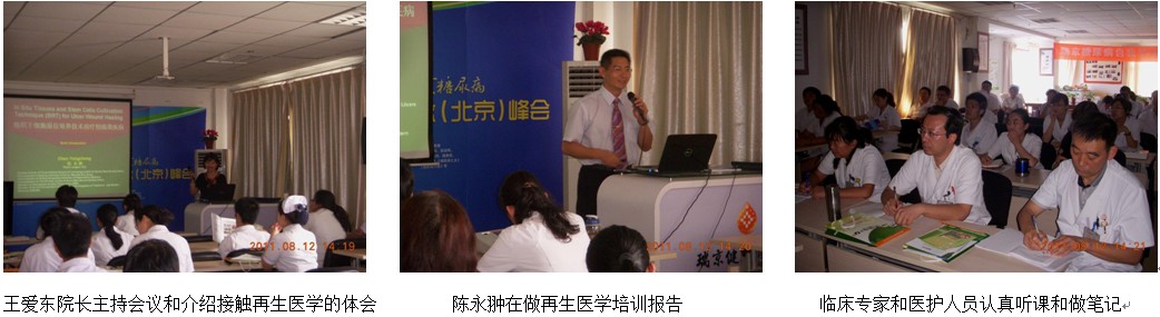 2011年8月15日下午2時30分,再生醫(yī)學(xué)專題培訓(xùn)會在醫(yī)院的四樓會議室按時召開。醫(yī)院糖尿病潰瘍科的全體醫(yī)護(hù)人員和其它科室的大部分技術(shù)骨干30余人參加這次培訓(xùn)會,培訓(xùn)會由王愛東院長主持,她向大家介紹了在一次國際糖尿病會議上認(rèn)識陳教授的經(jīng)過和聆聽了陳教授的再生醫(yī)學(xué)報告后的感受,要求各位專家和護(hù)理人員認(rèn)真聽課,利用這次難得的機(jī)會學(xué)習(xí)掌握好皮膚再生復(fù)原技術(shù)。陳教授則根據(jù)該醫(yī)院的特色,專門準(zhǔn)備了培訓(xùn)演講內(nèi)容,在將近2小時的培訓(xùn)會里,以“The New Development of In Situ Tissues and Stem Cells Cultivation Technique for Diabetic Wound Healing (組織干細(xì)胞原位培養(yǎng)技術(shù)治療糖尿病潰瘍新進(jìn)展)”為題,分以下四個部分向大家做了一次較為系統(tǒng)而又通俗易懂的培訓(xùn):1、燒傷皮膚原位再生醫(yī)學(xué)的發(fā)明創(chuàng)立與燒傷皮膚再生復(fù)原臨床實(shí)效;2、K-19型干細(xì)胞原位培養(yǎng)再生燒傷全厚皮壞死皮膚的機(jī)理; 3、皮膚原位再生技術(shù)在糖尿病潰瘍領(lǐng)域應(yīng)用新進(jìn)展;4、皮膚原位再生復(fù)原技術(shù)創(chuàng)面治療臨床規(guī)范。培訓(xùn)報告很受大家的歡迎,大家聽得非常認(rèn)真和投入,認(rèn)為這次的培訓(xùn)太及時、太重要了!大家都為學(xué)習(xí)和了解到如此先進(jìn)而又簡單易學(xué)的新技術(shù)感到無比的激動和興奮。北京中西醫(yī)結(jié)合學(xué)會燒傷專業(yè)委員會的彭韶君秘書、何蓮老師和郭軍老師到會免費(fèi)為這次培訓(xùn)會的醫(yī)護(hù)人員提供了再生醫(yī)學(xué)資料也很受歡迎。