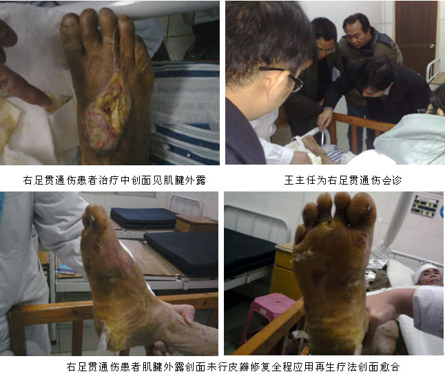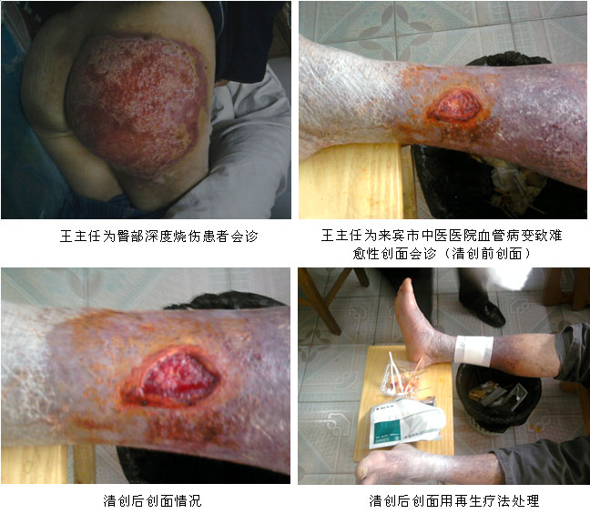 另外,在廣西與各醫(yī)院技術(shù)交流期間,王主任還于2011年1月16日應來賓市中醫(yī)醫(yī)院周國榮院長的邀請,到該醫(yī)院為一例下肢血管病變造成的一例難愈性潰瘍創(chuàng)面患者進行了會診和指導。