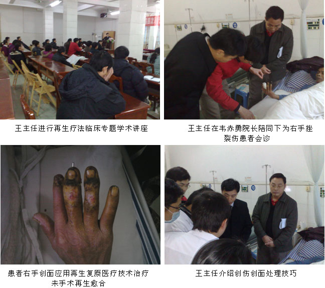 會后,王主任在該院院長韋赤勇、醫(yī)務科科長蔡凱及大外科主任、醫(yī)學專家等陪同下,深入該院創(chuàng)傷外科病房為幾例創(chuàng)瘍患者會診。韋赤勇院長在同王主任的交流中講到,通過近兩年王主任到該院的多次臨床學術(shù)交流與指導,對該醫(yī)院在治療臨床難愈性創(chuàng)瘍創(chuàng)面和大面積深度燒傷創(chuàng)面上起到了很好的臨床傳幫帶的作用,尤其是該院近期收治的右手挫裂傷及右足貫通傷患者均未行常規(guī)手術(shù)治療而是全程應用再生復原醫(yī)療技術(shù)治療,現(xiàn)該患創(chuàng)面均自行愈合,右手和右足外觀和功能均得到了最大限度地恢復。韋赤勇院長還表示,再生復原醫(yī)療技術(shù)有效地幫助了該院醫(yī)務人員解決了以前很難解決的臨床難題,目前再生醫(yī)療技術(shù)在該院的各科室都進行了深入地推廣和應用,今年該醫(yī)院要成立燒傷創(chuàng)瘍專科,以更好的造福貴港市廣大的創(chuàng)瘍患者。