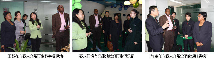 上午, Dr.Betty一行饒有興趣地參觀了人體組織器官原位再生復(fù)原俱樂部、全消化道膠囊鏡和中心實(shí)驗(yàn)室,現(xiàn)場(chǎng)聽取了技術(shù)人員對(duì)人體組織器官原位再生復(fù)原科學(xué)技術(shù)的詳細(xì)介紹。隨后,大家來(lái)到了集團(tuán)多功能會(huì)議廳進(jìn)行了簡(jiǎn)單的商談后,負(fù)責(zé)非洲區(qū)域經(jīng)營(yíng)的國(guó)際部的王晨光向客人們介紹了美寶國(guó)際集團(tuán)的整體情況,接著由組織器官再生醫(yī)學(xué)專家陳永翀主任介紹人體組織器官原位再生復(fù)原科學(xué)技術(shù)。在講解過程中,陳主任采用圖文并茂的方式,展示了燒傷皮膚原位再生復(fù)原技術(shù)的臨床治療效果和人體各個(gè)組織器官原位再生復(fù)原在老齡人和最晚期癌癥患者身上所取得的驚人結(jié)果,同時(shí)深入淺出的講解人體組織器官原位再生復(fù)原技術(shù)的科學(xué)理論。Dr. Betty 院長(zhǎng)一行深深地被再生醫(yī)學(xué)科學(xué)的研究成果所震驚,也被神奇的臨床治療效果所折服,并表示希望盡快引進(jìn)該項(xiàng)先進(jìn)技術(shù)的強(qiáng)烈意愿