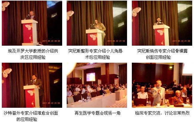 隨后,來自埃及、突尼斯、沙特、蘇丹的另外8個臨床專家和教授先后上臺演講,介紹他們近年來,特別是近3年來在中國專家的指導下應用再生醫(yī)學治療燒傷、創(chuàng)傷、潰瘍、供皮區(qū)創(chuàng)面、骨裸露創(chuàng)面、外科感染創(chuàng)面、各科難愈合創(chuàng)面、頜面外科術后不愈合創(chuàng)面等,應用再生醫(yī)學技術所取得的神奇臨床效果和經(jīng)驗。會場內(nèi)提問、討論和請教非常踴躍,整個會場的學術氛圍進入到了高潮! 原計劃2小時的再生醫(yī)學專題會在不知不覺中延長到了3小時,但是依然還有許多專家意猶未盡,繼續(xù)留在會場相互交流和討論直到傍晚近7點鐘才離開。