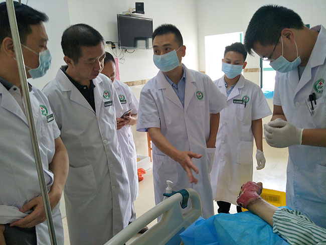 7月8日上午,應(yīng)三水蘆苞眾泰醫(yī)院汪國(guó)斌院長(zhǎng)的邀請(qǐng),再生醫(yī)療專(zhuān)家、中國(guó)中西醫(yī)結(jié)合學(xué)會(huì)燒傷專(zhuān)業(yè)委員會(huì)常務(wù)委員王洪生等到該院對(duì)一位因車(chē)禍致嚴(yán)重撕脫傷創(chuàng)面患者進(jìn)行會(huì)診,并現(xiàn)場(chǎng)示范清創(chuàng)和換藥。會(huì)診后給相關(guān)科室及一線臨床醫(yī)務(wù)人員進(jìn)行了再生醫(yī)療技術(shù)在難愈性創(chuàng)面的臨床應(yīng)用授課,此次活動(dòng)對(duì)推動(dòng)該院在再生醫(yī)療技術(shù)的臨床應(yīng)用方面起到了指導(dǎo)和帶動(dòng)作用。